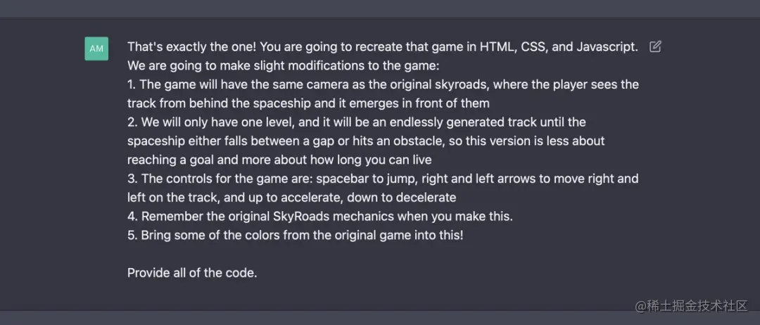 任务 2:让 GPT-4 从头构建一款电子游戏。在这项任务中,提示语大概是说,「我想创建一款 3D 游戏,但不知道如何编写代码,然后让 GPT-4 帮助制作这款游戏,并建议使用 BabylonJS、HTML 和 CSS 编写」。
