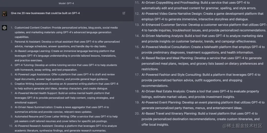 任务 8:基于 GPT-4 创造 20 种新业务,并说明这些工作可以做哪些事。GPT-4 给出的答案如下所示:例如基于 GPT-4 构建个人 Al 助理,其可以提供个性化建议、管理日程安排、回答问题和处理日常任务;又比如基于 GPT-4 开发辅导类产品,帮助学生完成家庭作业、论文写作、考试准备、在线辅导等。