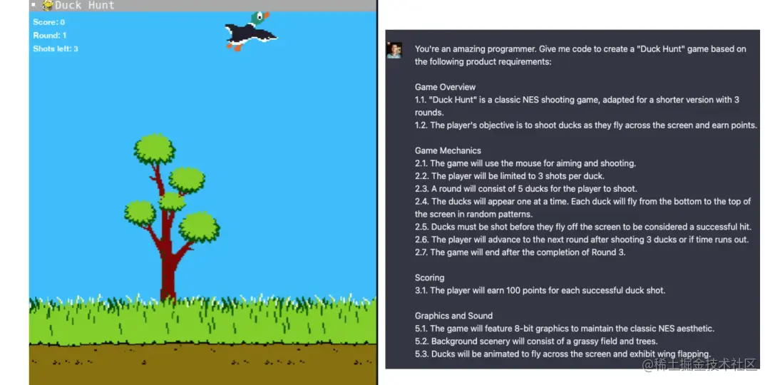 任务 15:要求 GPT-4 在几秒钟内编写《打鸭子》游戏。提示词大概是,GPT-4 你是一个了不起的程序员。根据以下产品要求,为我创建《打鸭子》游戏的代码。游戏中,你可以要求 GPT-4 使用鼠标进行瞄准和射击;每只鸭子只能射 3 次;鸭子在飞离屏幕之前必须被射杀才能被视为成功命中等。