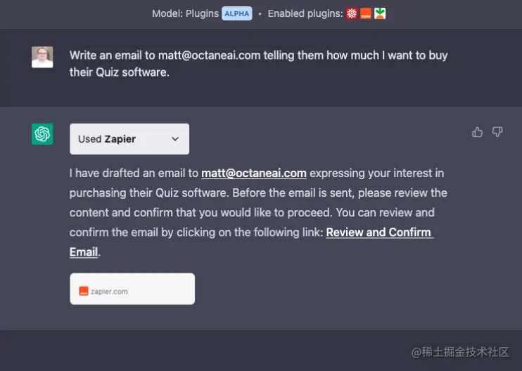 任务 7:让 GPT-4 写邮件并发送。输入提示,帮我写封邮件给 matt@octaneai.com,并告诉他们我想购买 Quiz 软件。GPT-4 表示自己已经起草了一封电子邮件给 matt@octaneai.com 表达你对购买他们测验软件的兴趣。在发送电子邮件之前,请检查内容并确认要继续。你可以通过单击以下链接查看并确认电子邮件: