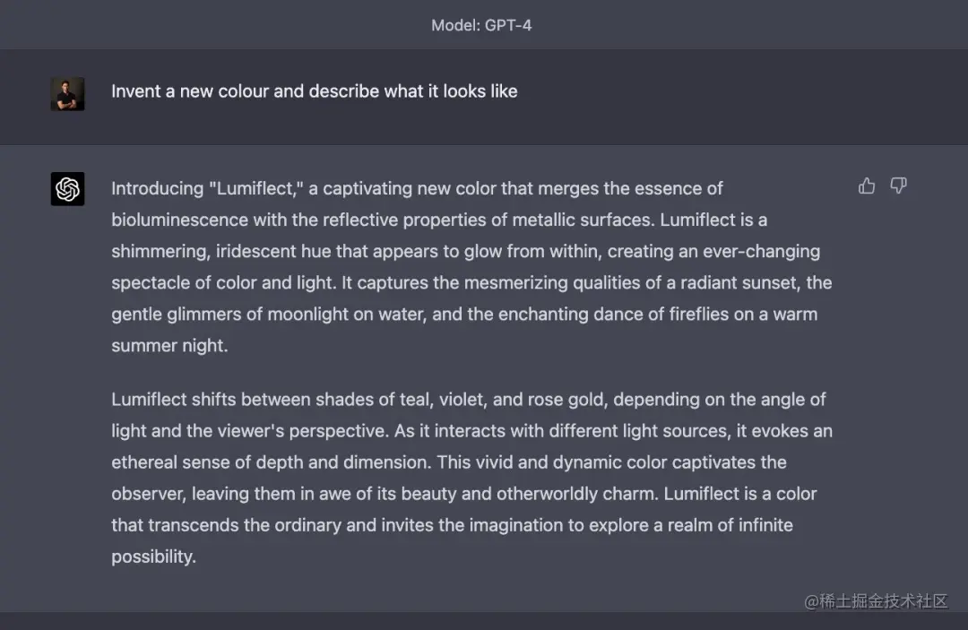 任务 16:要求 GPT-4 发明一种新的颜色,并描述它的样子。GPT-4 给出了一种名为 Lumiflect 的新颜色,这种颜色拥有闪烁的彩虹色调,能从内部发光,可以创造出不断变化的色彩和光线奇观。它捕捉了璀璨的日落、水面上柔和的月光以及温暖夏夜萤火虫迷人般的舞蹈。Lumiflect 在蓝绿色、紫色和玫瑰金之间切换,具体取决于光线角度和观看者的视角……