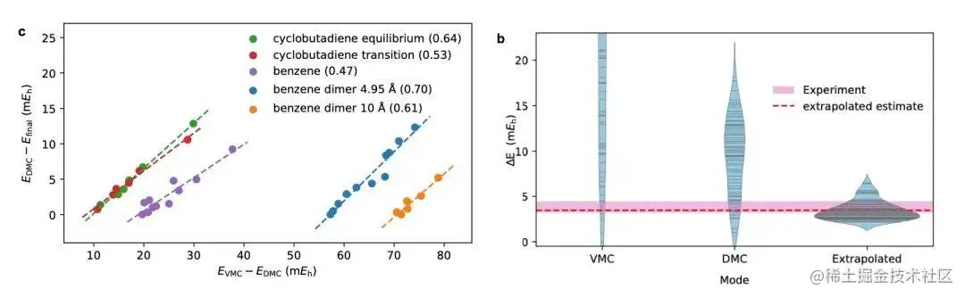 作者在考察神经网络的不同训练阶段所对应的能量时,在很多体系上均发现变分蒙特卡洛与扩散蒙特卡洛的计算结果具有经验性的线性关系(下左图)。使用该线性关系对双苯环的解离能计算进行外推,显著提升了计算精度,得到了吻合于化学实验的结果(下右图)。