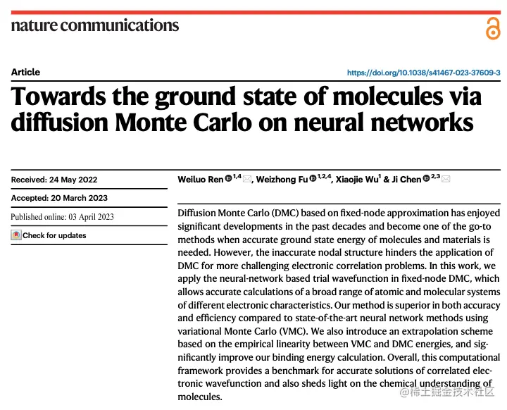 时隔四个月,ByteDance Research 与北京大学物理学院陈基课题组又一合作工作登上国际顶级刊物 Nature Communications:论文《 Towards the ground state of molecules via diffusion Monte Carlo on neural networks 》将神经网络与扩散蒙特卡洛方法结合,大幅提升神经网络方法在量子化学相关任务上的计算精度、效率以及体系规模,成为最新 SOTA。