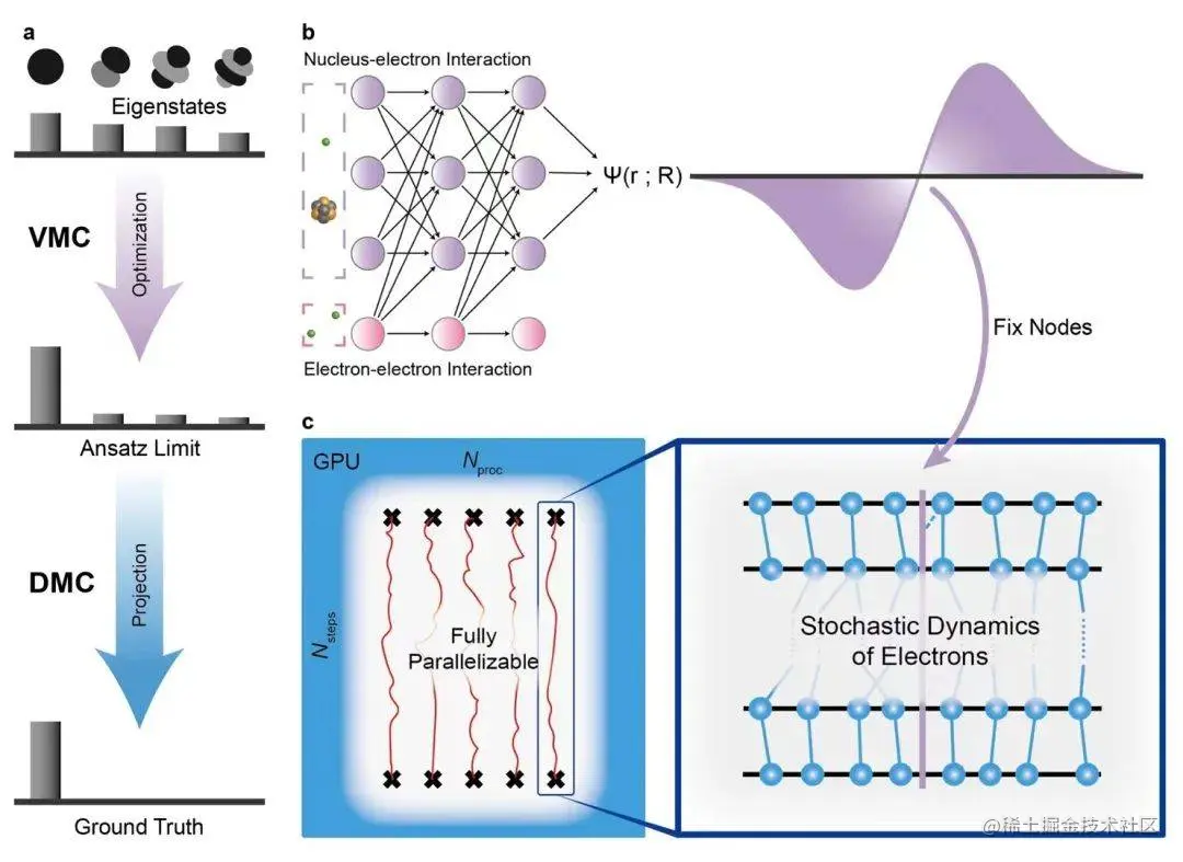 本工作中,作者将 SOTA 的神经网络 (FermiNet) 作为试探波函数与扩散蒙特卡洛方法结合。新的计算方法相比于 FermiNet 显著提升了精度并减少了所需的计算步数。本工作中所设计并实现的扩散蒙特卡洛软件具有神经网络友好、GPU 友好、并行友好的特点,可以与广泛的神经网络波函数结合,自动提升其精度与效率。