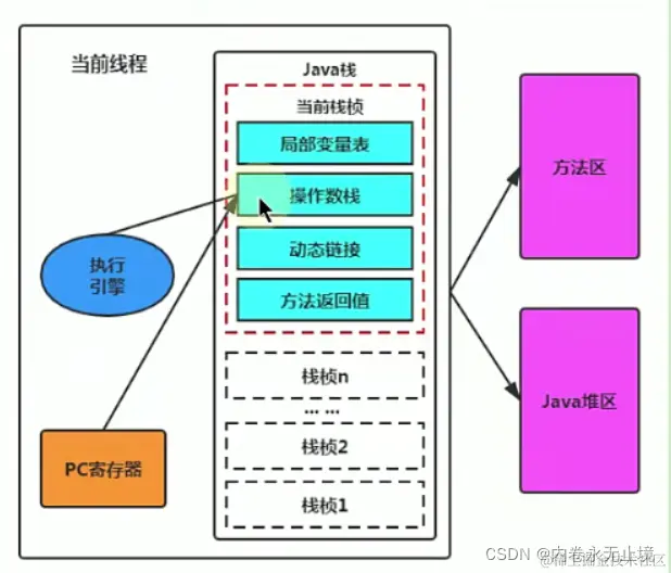 在这个线程上正在执行的每个方法都各自对应一个栈帧〈Stack Frame) .枝帧是一个内存区块,是一个数据集,维系着方法执行过程中的各种数据信息。