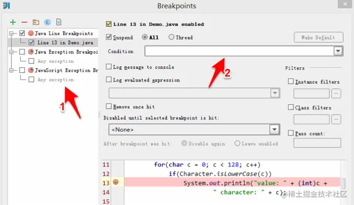 箭头1指向的是你曾经设置过的断点,箭头2可以设置条件断点(满足某个条件的时候,暂停程序的执行,如 c==97)。结束调试后,应该在箭头1处把所设的断点删除(选择要删除的断点后,点击上方的红色减号)。