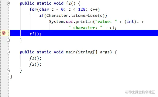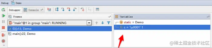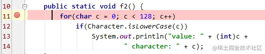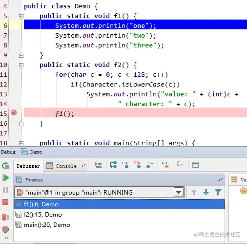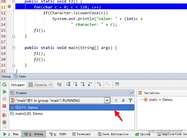 IDE下方出现Debug视图,红色的箭头指向的是现在调试程序停留的代码行,方法f2()中,程序的第11行。红色箭头悬停的区域是程序的方法调用栈区。在这个区域中显示了程序执行到断点处所调用过的所用方法,越下面的方法被调用的越早。