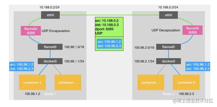 UDP 是 Flannel 默认的后端实现方式。它使用 UDP 协议创建一组 overlay 网络,连接 Kubernetes 集群中的所有节点。每个节点都会获取一个子网,并将其中的 IP 地址分配给其上运行的 Pod。
