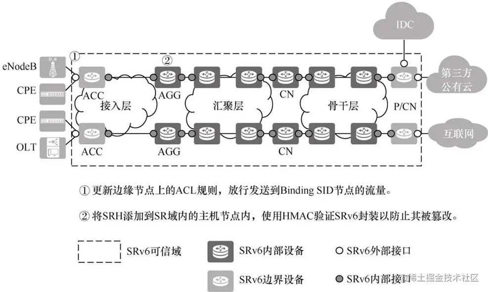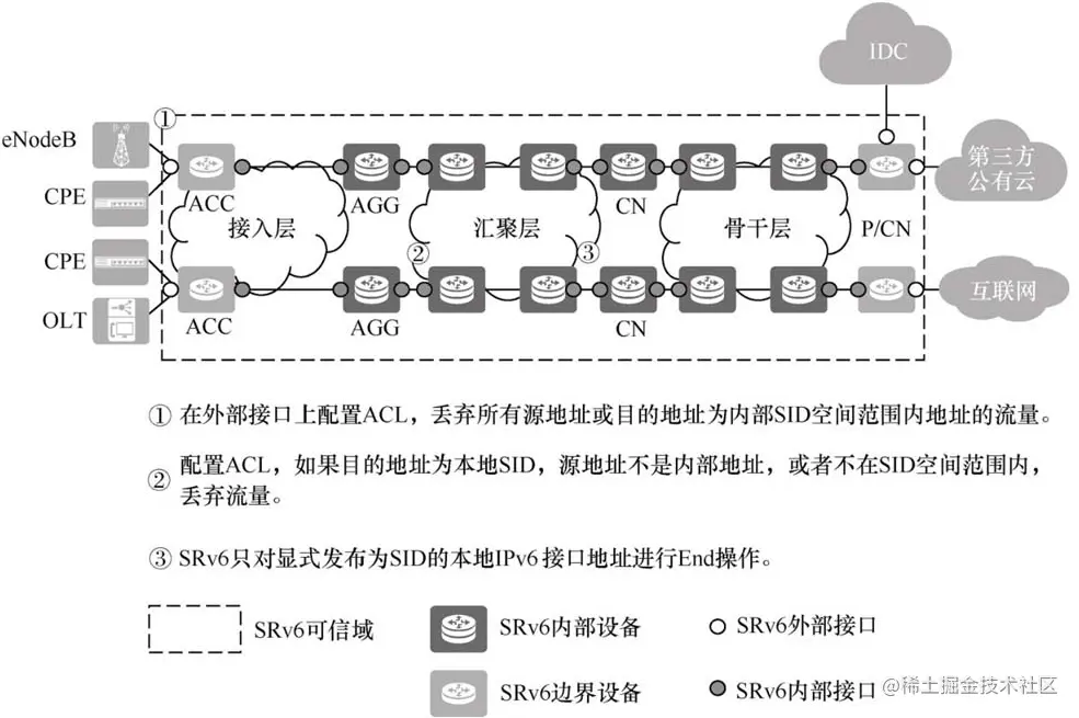 此外,面对一些特殊的情况,SID需要被发布到域外。为了确保来自域外的流量安全可信,还需要在网络的边缘和内部部署对应的过滤规则或安全校验,比如ACL(Access Control List,访问控制列表)或者HMAC进行安全校验,将非法携带域内信息的流量丢弃。