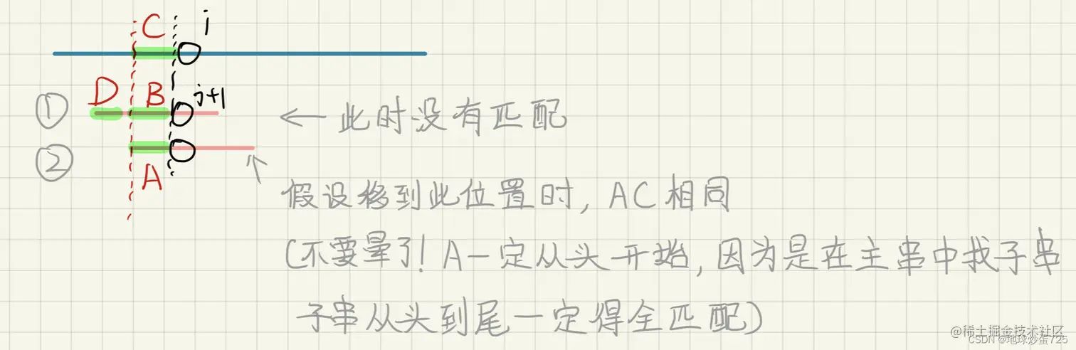 如果想要匹配,模板串开头开始j的长度的部分一定i前部分一定要匹配得上我们才会开始匹配第i个位置,不然根本不会轮到i位置比较,因为前面都失配了。