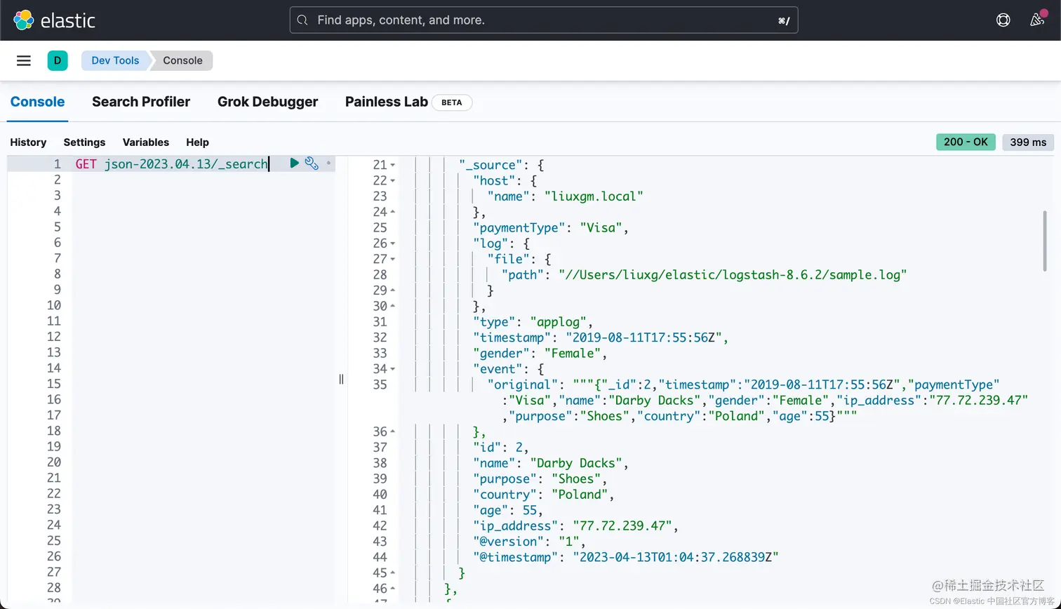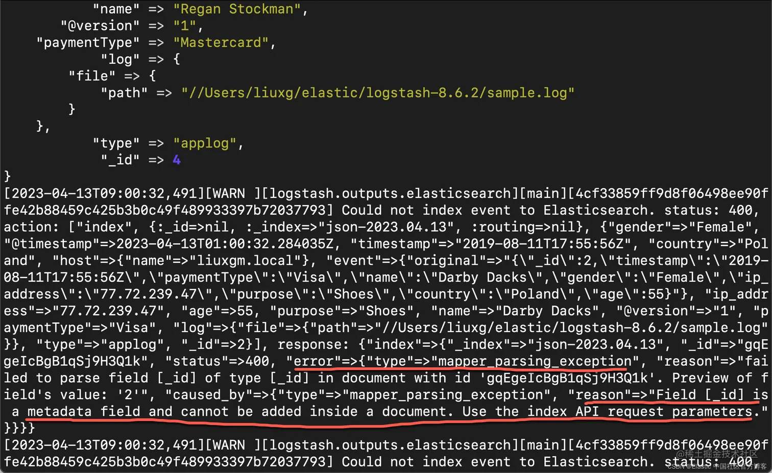 因此,当你尝试使用 Logstash 摄取它时,你将收到以下错误。 即使你在单独索引这些文档时也会遇到上述错误。比如我们使用如下的一个例子: