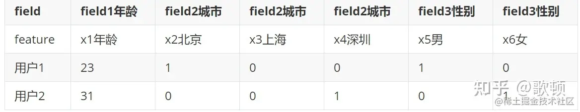 - 1 FFM模型在FM的基础上引入了field概念,即每一个特征又属于哪个field,field和feature是一对多,如下表格展示: