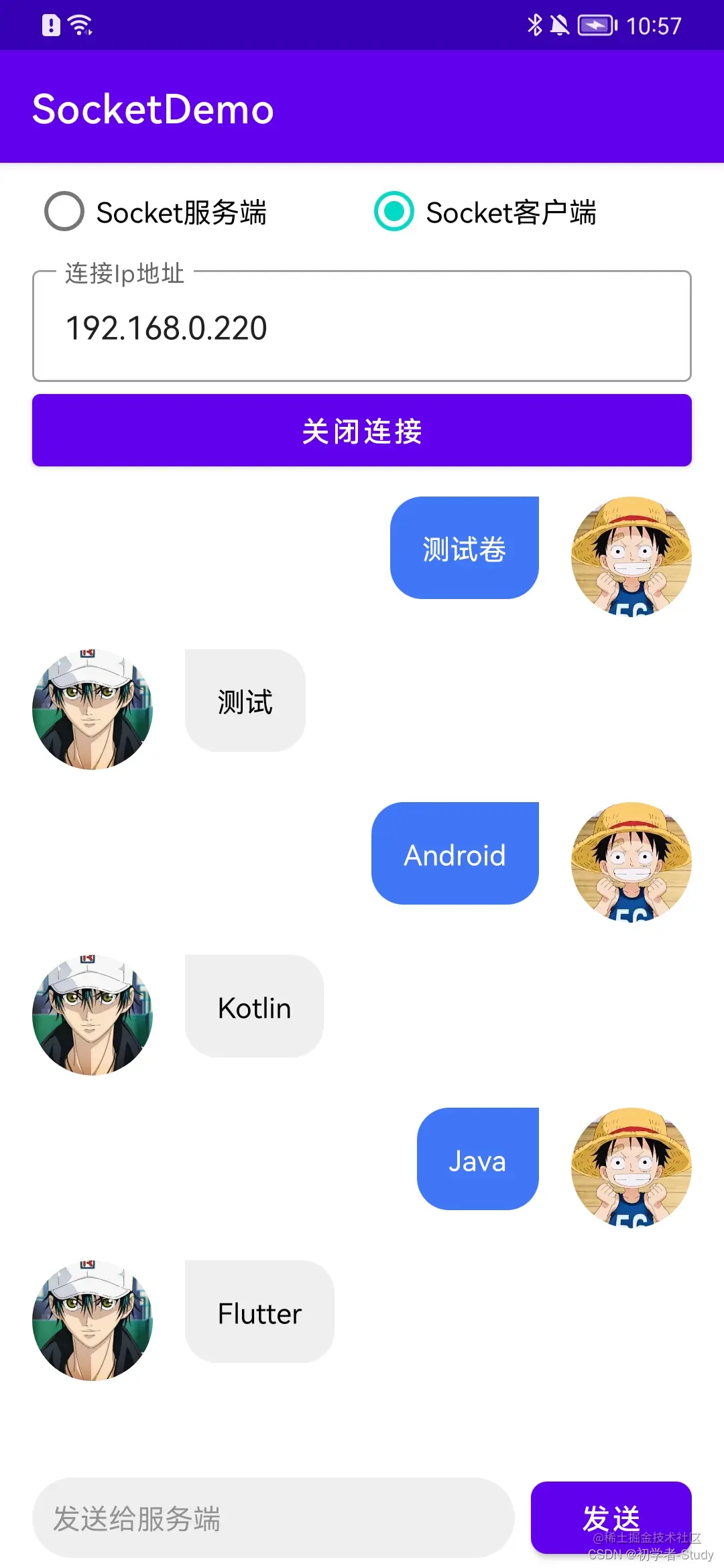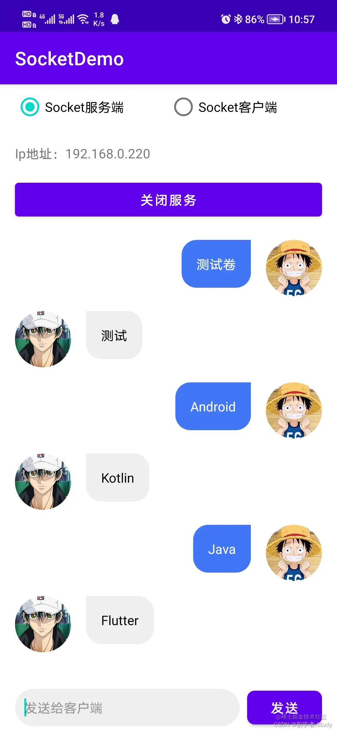 Socket通讯在很多地方都会用到,Android上同样不例外,Socket不是一种协议,而是一个编程调用接口(API),属于传输层,通过Socket,我们才能在Andorid平台上通过 TCP/IP协议进行开发。先看看效果图: