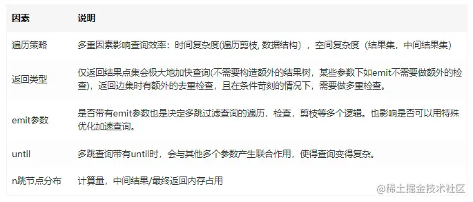 多跳过滤的性能受很多因素影响。以下总结一些会影响到性能的因素以供参考: