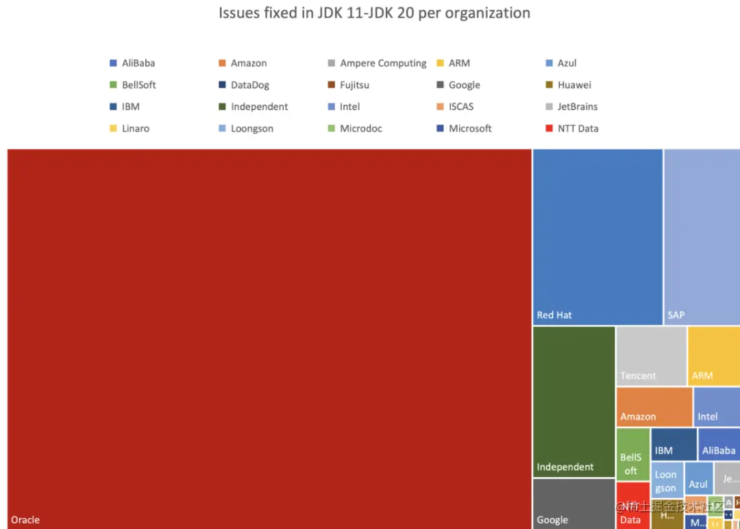 Java 20 包含了许多新的特性和改进。根据 Oracle 官方透露,在 Java 20 中,在标记为固定的 2314 个 JIRA 问题中,1595 个是由甲骨文完成的,而 719 个是由 Java 社区的其他成员贡献的。其中国内的阿里巴巴、华为、腾讯都有不少的贡献。