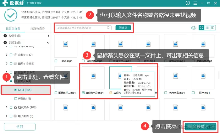 4.选择完毕所有需要恢复的文件后,点击 【恢复】 ,并选择视频恢复后的保存位置后等待恢复完成即可。