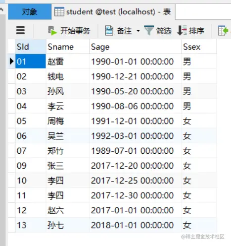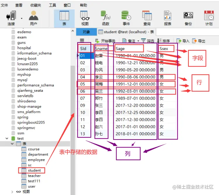 4. 列 : 表中的某一个字段,所有表都是由一个或多个列组成的。