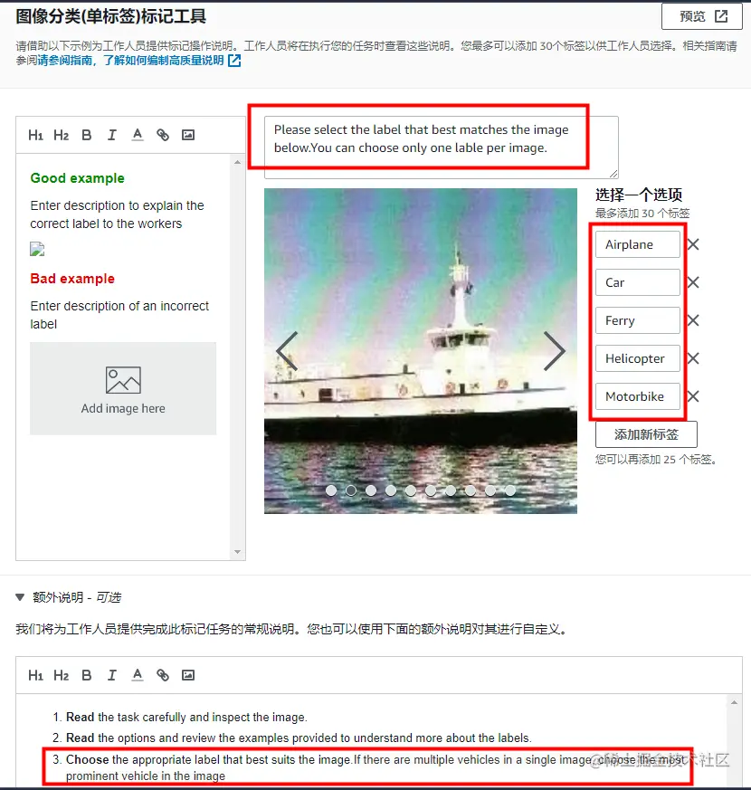 展开 Additional instructions(其他说明),添加以下文本到第 3 步:If there are multiple vehicles in a single image, choose the most prominent vehicle in the image(如果一张图像中有多个交通工具,请选择在图像中最突出的交通工具)。