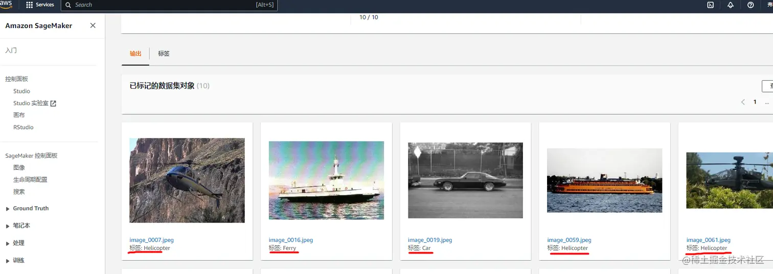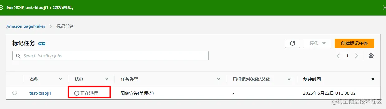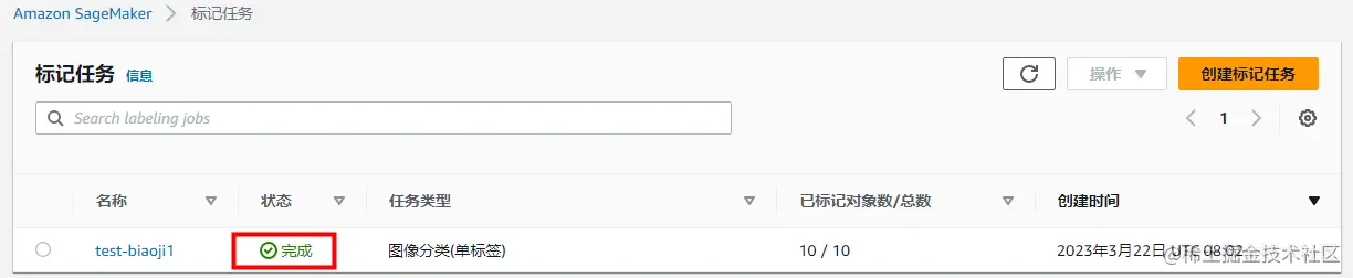 创建成功后新的标记任务被列在 SageMaker 控制台 Labeling jobs(贴标作业)部分的下方,其 Status(状态)为 In progress,Task type(任务类型)为 Image Classification (Single Label) (图像分类(单个标签))。标记任务可能需要几分钟才能完成。 在 Amazon Mechanical Turk 公共工作人员标记数据后,状态变为 Complete。