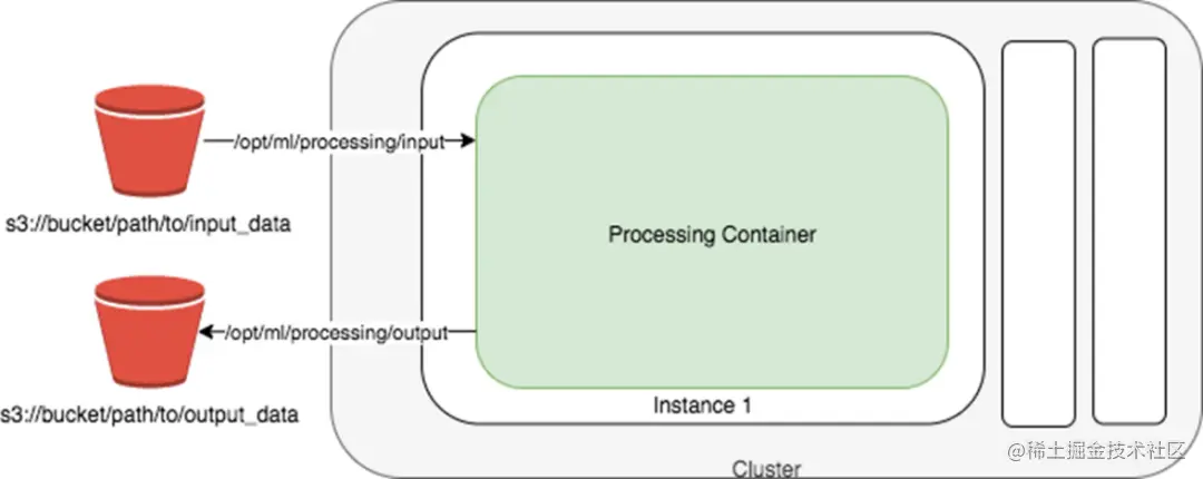 SageMaker Processing job 要求数据的输入和输出都需要在 S3 ,基本原理图如下:
