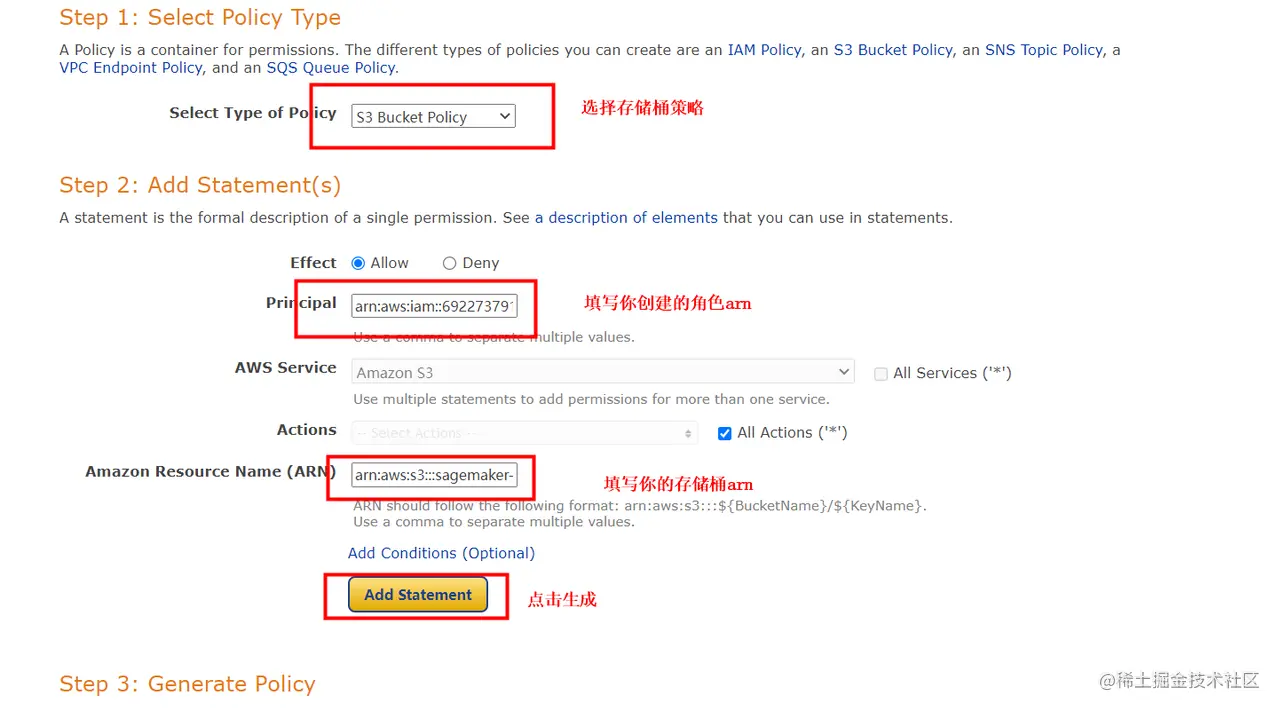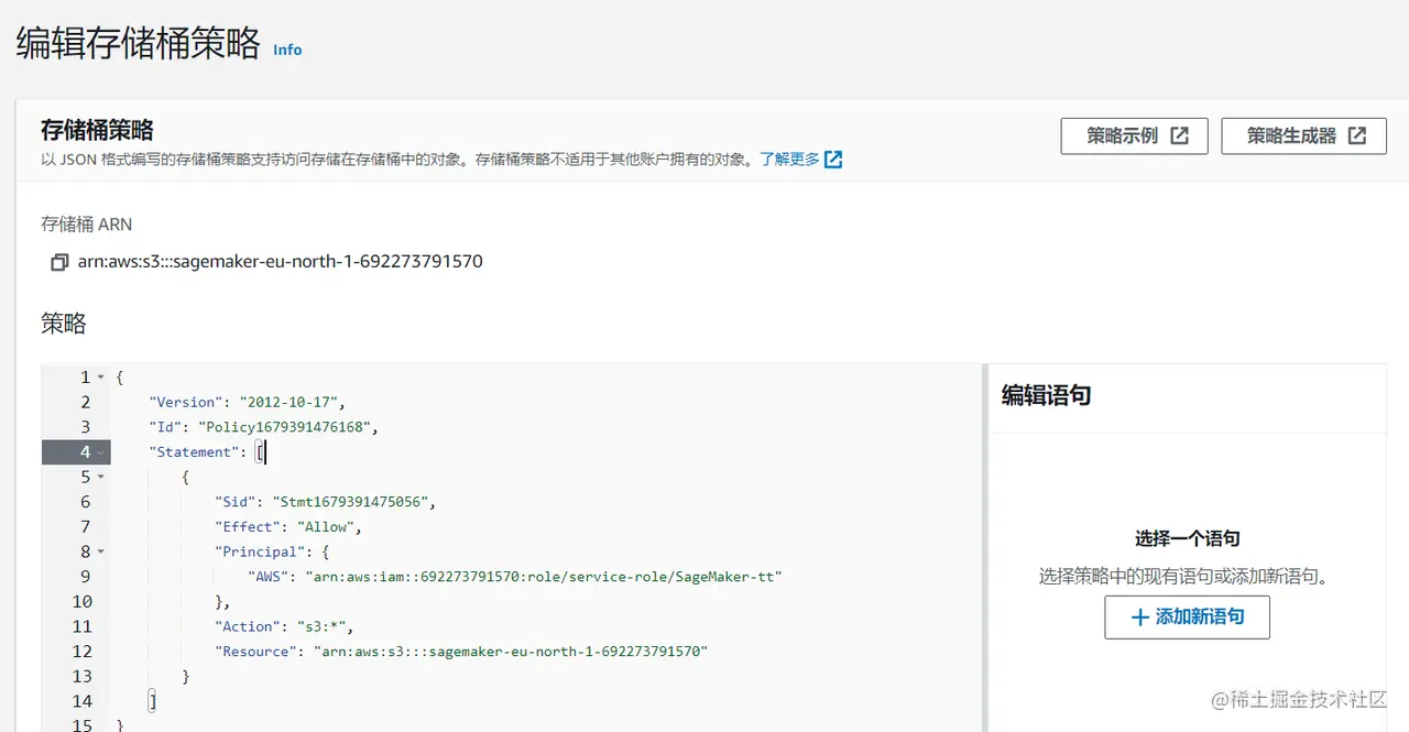 2.2:配置存储桶策略——我们可以使用SageMaker自带的策略生成器,正确填写对应信息后一键快捷生成Json策略:
