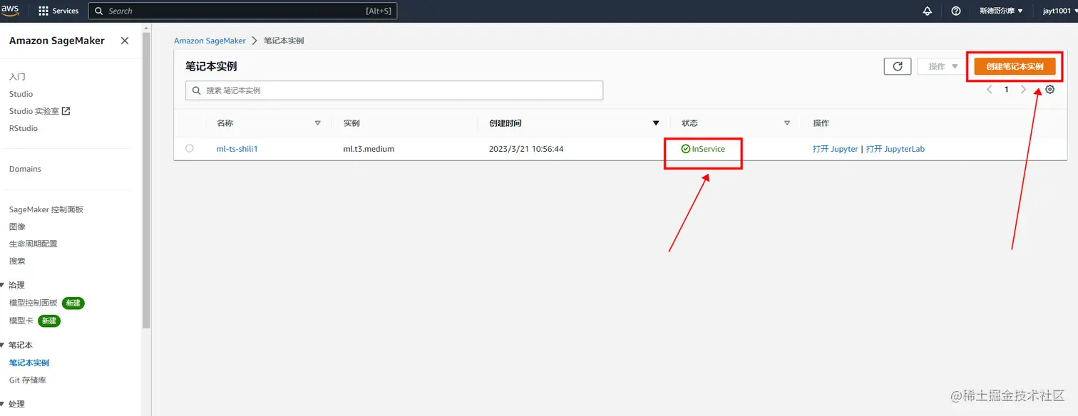 亚马逊 SageMaker 笔记本实例创建好之后会在图中的笔记本实例中新增一条状态为Pending的数据,稍等一会儿,状态会自动变为InService,此时改实例为可使用状态。