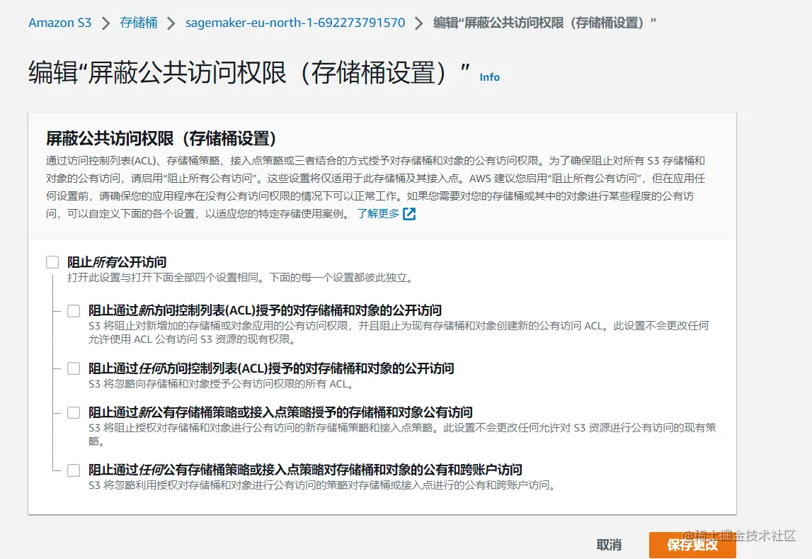 2.1:修改存储桶权限——进入编辑“屏蔽公共访问权限(存储桶设置)”位置,把”阻止所有公开访问“复选框标记为未选中状态