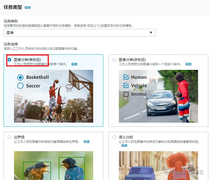 在 Task type(任务类型)部分,为 Task category(任务类别)选择 Image(图像)。对于 Task selection(任务选择),选择 Image Classification (Single Label) (图像分类(单标签)),然后选择 Next(下一步)。