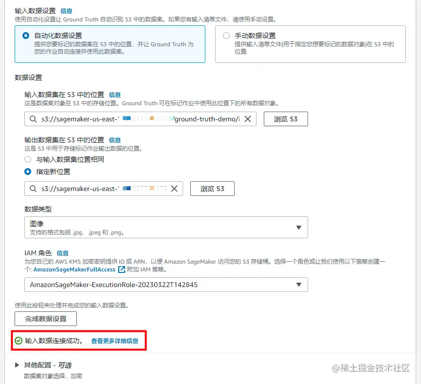 在标记任务详细信息页面,按照下图进行配置,图中的两个路径也可以直接从我们早前所运行 Jupyter notebook 的 print 语句里面去复制对应的值,配置成功后,点击”完成数据设置“,就会出现输入数据链接成功的提示。