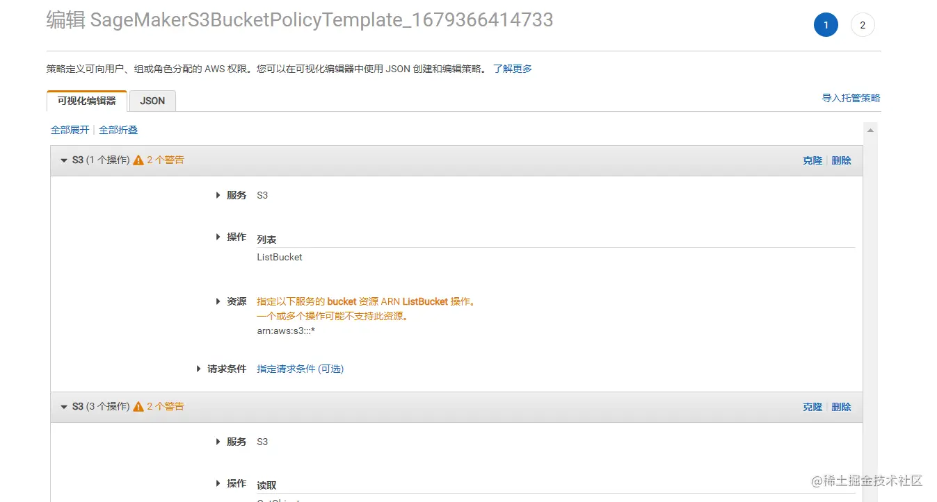 我这里将资源范围设置为所有S3存储桶(你们也可以指定刚刚创建的存储桶)都放开,然后保存后就会生成json策略,如下所示: