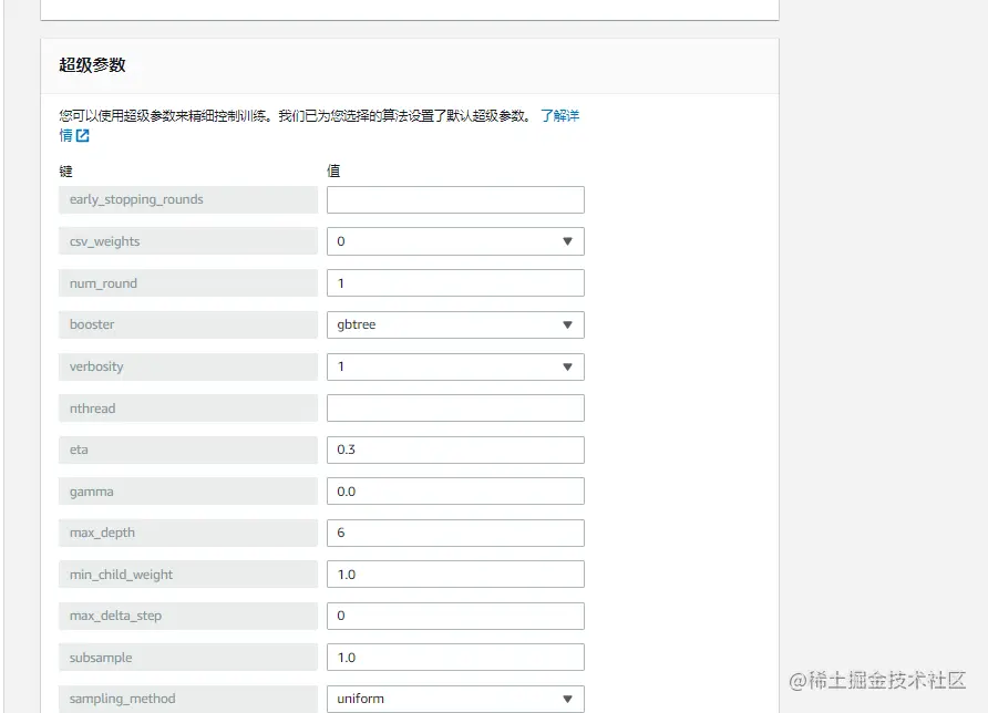 下面列举出了一些可以设置的可选超参数。包含 Amazon SageMaker XGBoost 算法必需或最常用的超参数子集。这些是由用户设置的参数,以便于从数据中评估模型参数。