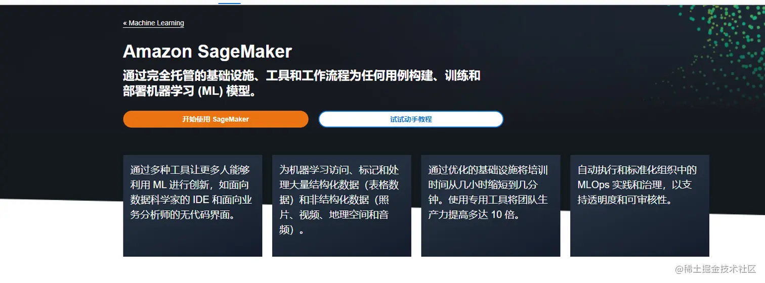 最近刚好受邀参与了亚马逊云科技【云上探索实验室】活动,使用了它们推出的 Amazon SageMaker来开展机器学习的工作,体验下来的效果是让我很满意的,无论是在构建,数据标注还是模型训练部署等方面都带来了巨大的效率提升,通过使用它预置的常用算法,以及自动模型调优大大降低了模型构建和训练的难度,让我们更容易的使用ML。另外,Amazon SageMaker与其他亚马逊网络服务(AWS)产品集成,如AWS S3、AWS Glue和AWS Lambda,让我们能够轻松构建端到端的ML工作流程: