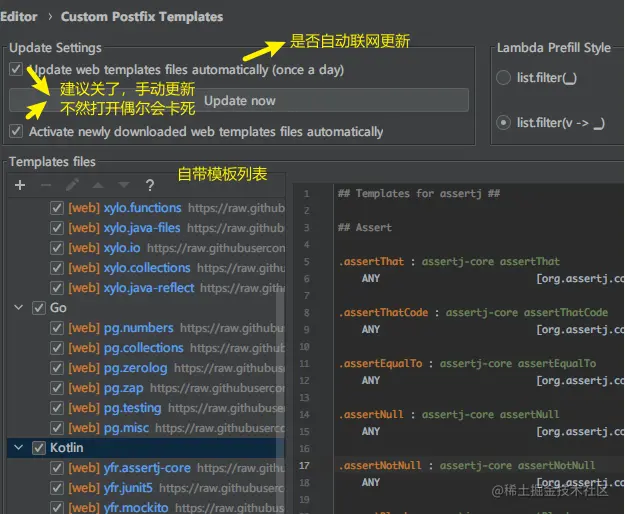 接着可以在 Setting → Custom Postfix Templates 看到一系列自带的模板配置: