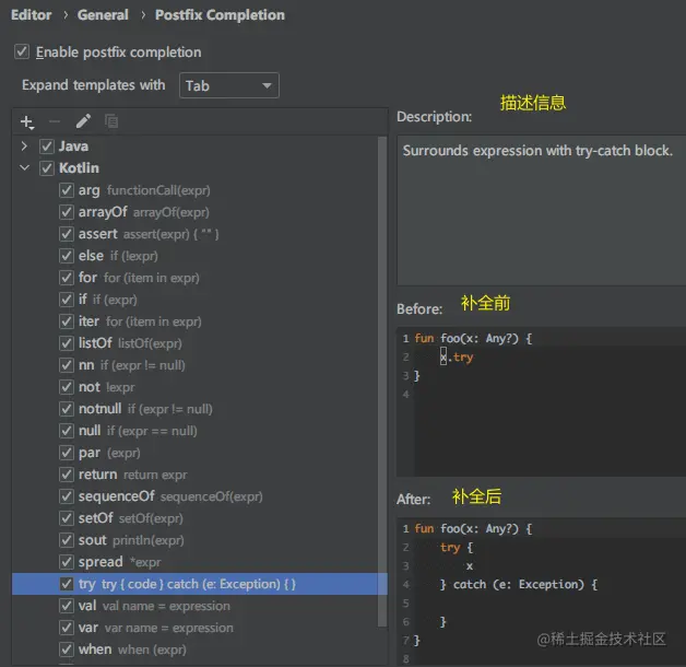 上面这个 try 就是内置模板,依次点击 Setting → Postfix Completion 可以看到都有哪些: