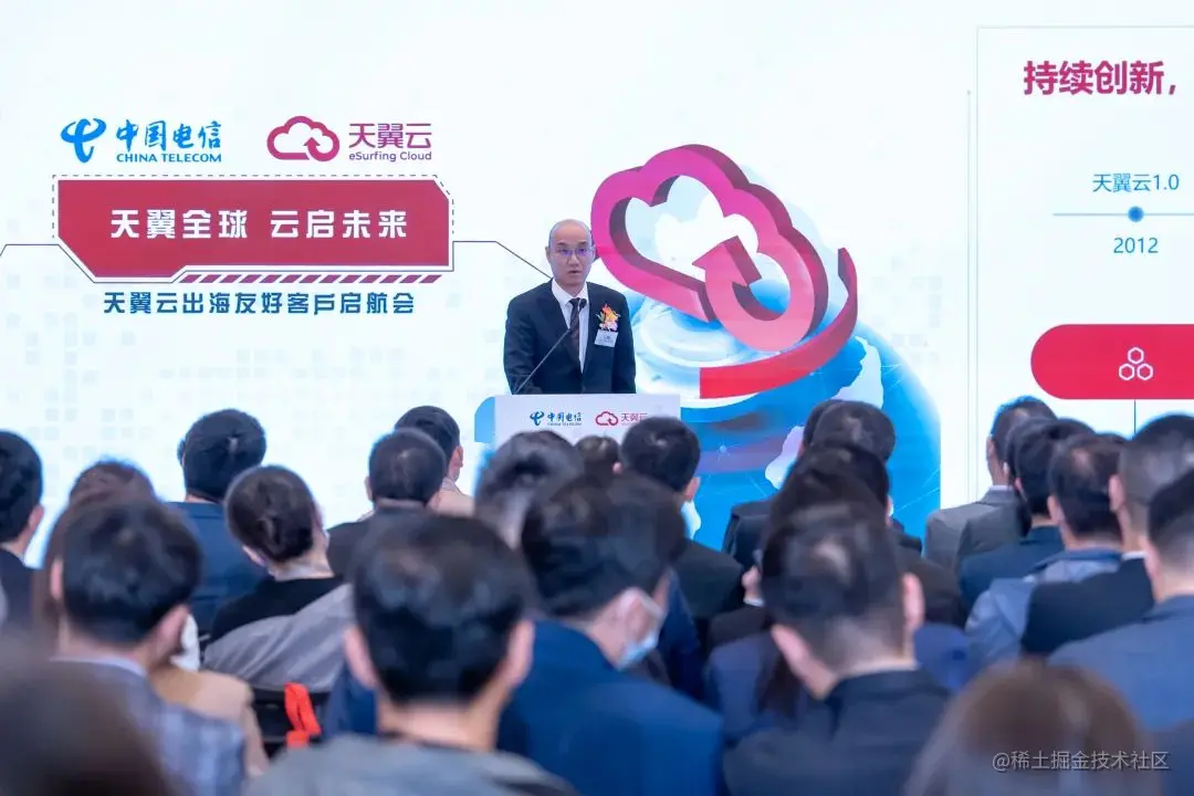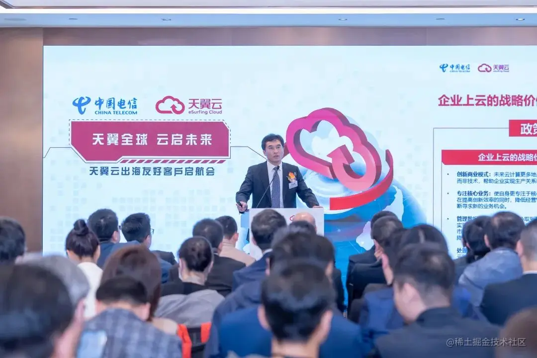 天翼云科技有限公司助理总经理、中国电信集团有限公司云计算首席专家江峰发表了题为“云途万里 展翼领航”的演讲,介绍了天翼云的发展历程以及安全可信和科技创新优势,基于丰富的实践经验和成熟的出海服务能力,天翼云将全力支持企业出海转型。