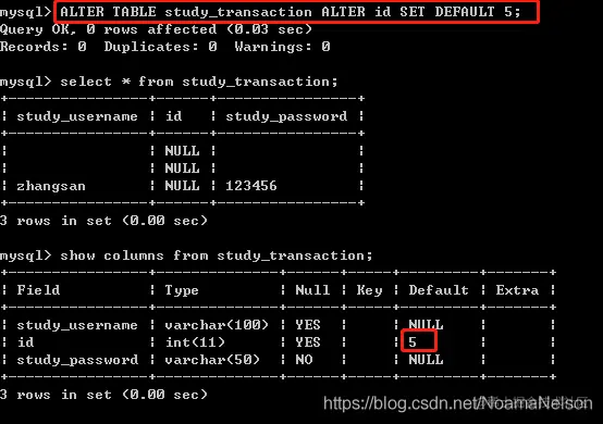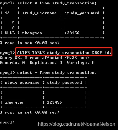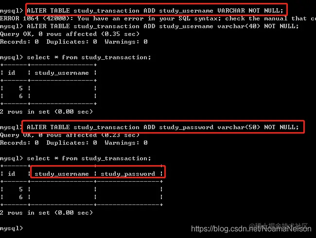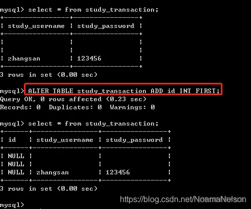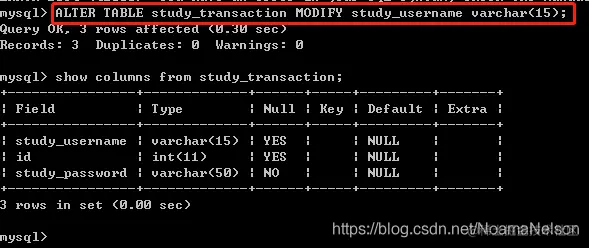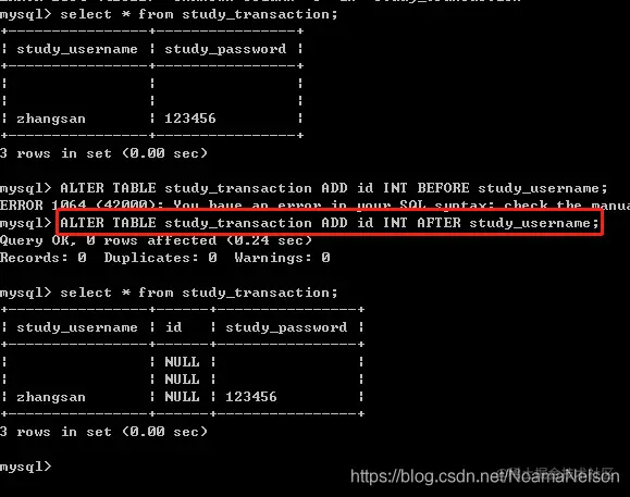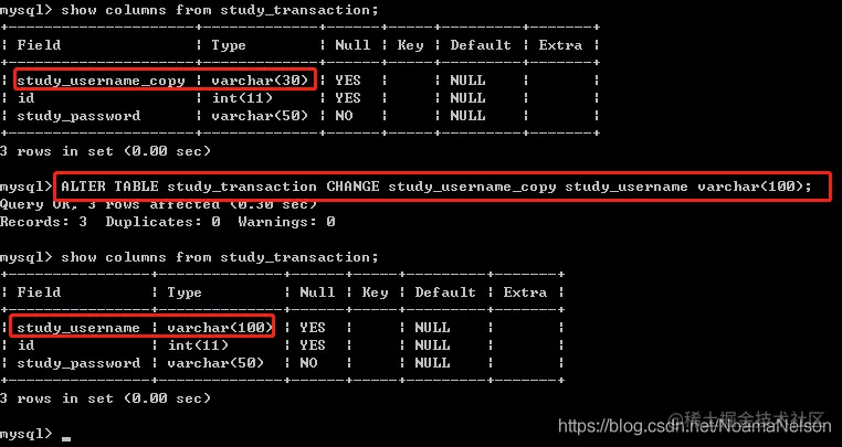 MySql 基础 - 笔记 9 -ALTER 命令 董嘉dongjia 2023-04-13 201 阅读1分钟 1、作用 使用 MySQL ALTER 命令,来修改数据表名或者修改数据表字段。 先准备测试数据表:就先用创建好的 study_transaction 2、添加表字段 在 study_transaction 中添加 study_username,study_password 3、删除表字段 删除 study_transaction 中的 id 4、新增或删除指定字段位置 5、查看数据表的结构变化 6、修改字段类型及名称 在 ALTER 命令中使用 MODIFY 或 CHANGE 子句 7、修改字段默认值 8、修改表名