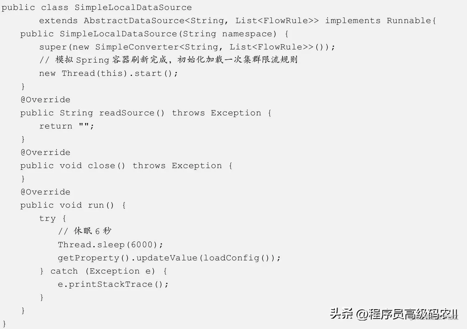 SimpleLocalDataSource类继承AbstractDataSource抽象类,同时SimpleLocalDataSource类的构造方法要求传入名称空间,用于指定一个SimpleLocalDataSource实例只负责加载指定名称空间的集群限流规则。SimpleLocalDataSource类的代码如下。