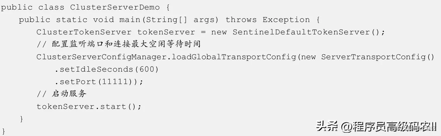 在独立应用模式下,需要手动创建ClusterTokenServer并启动,在启动之前需要指定监听端口和连接最大空闲等待时间等配置,代码如下。