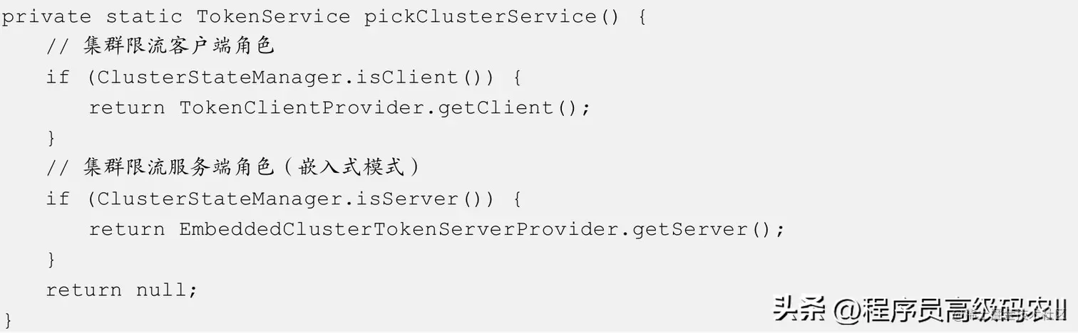 pickClusterService方法可根据节点当前角色获取TokenService实例。如果当前节点是集群限流客户端角色,则获取的TokenService实例类型为ClusterTokenClient,如果当前节点是集群限流服务端角色(嵌入式模式),则获取的TokenService实例类型为