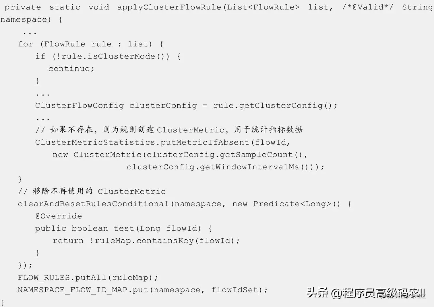 ClusterFlowConfig的sampleCount与windowIntervalMs这两个配置项用于为集群限流规则创建统计指标数据的滑动窗口,并在加载集群限流规则时创建,源码如下。