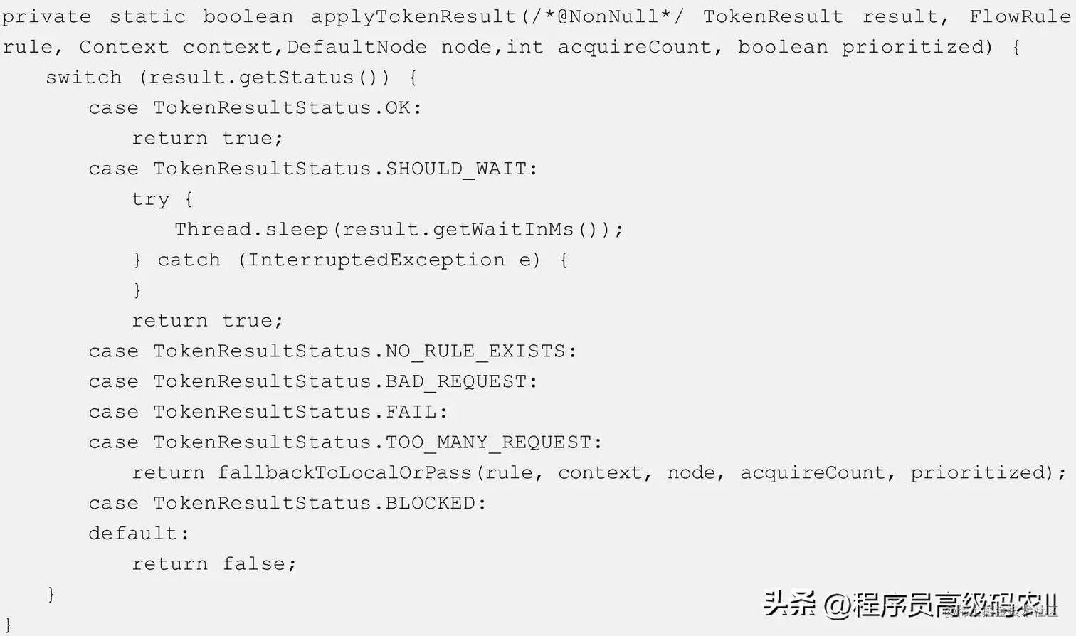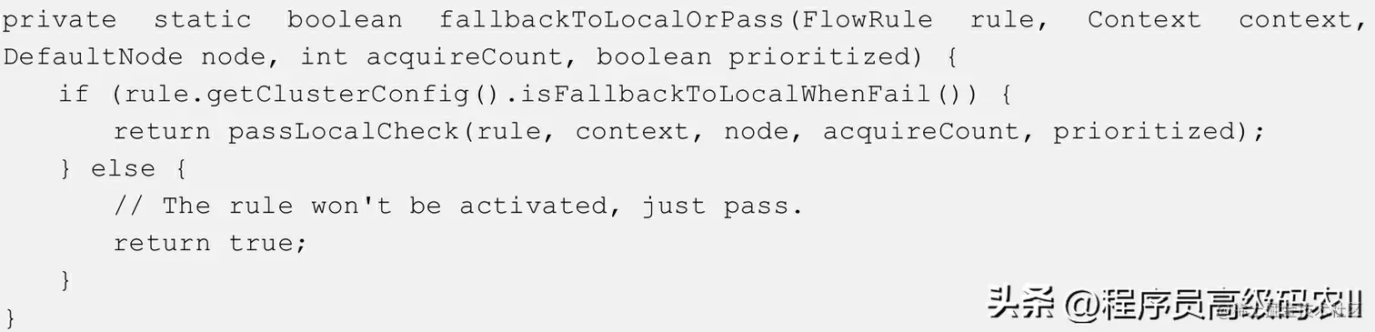 • 其他状态码均代表调用失败,根据规则配置的fallbackToLocalWhenFail是否为true决定是否回退为本地限流,如果需要回退为本地限流,则调用passLocalCheck方法重新判断。