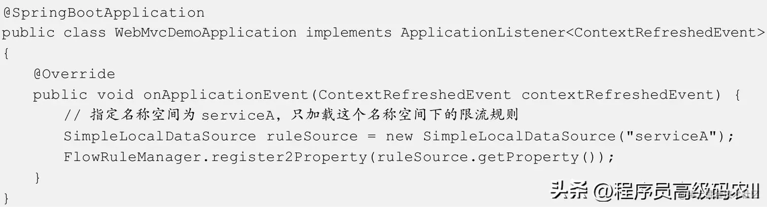 在Spring项目中,可通过监听ContextRefreshedEvent事件,在Spring容器启动完成后初始化创建动态数据源并为FlowRuleManager注册限流规则动态数据源,代码如下。
