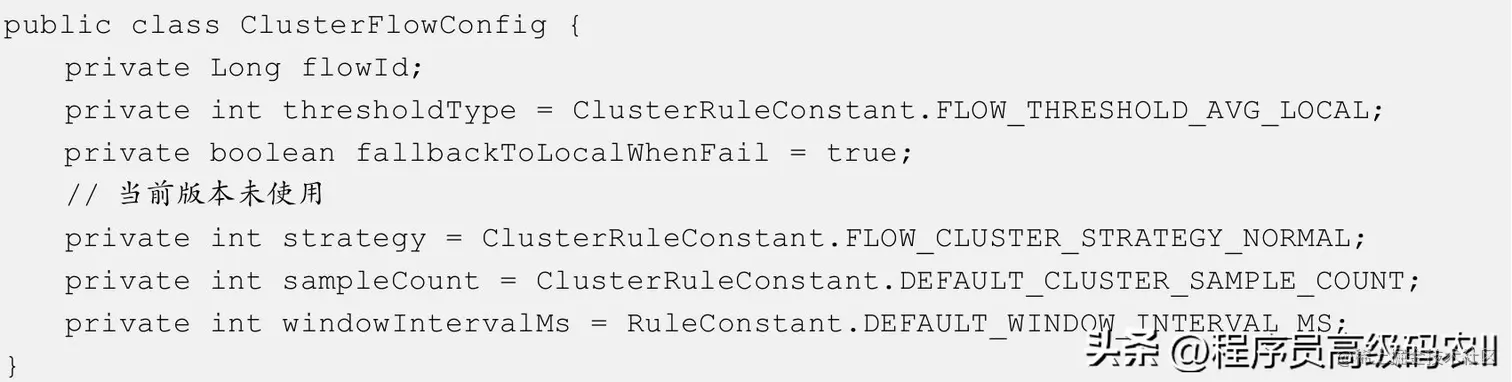 如果将一个限流规则配置为集群限流规则,则FlowRule实例的clusterConfig字段必须被配置,该字段的类型为ClusterFlowConfig。