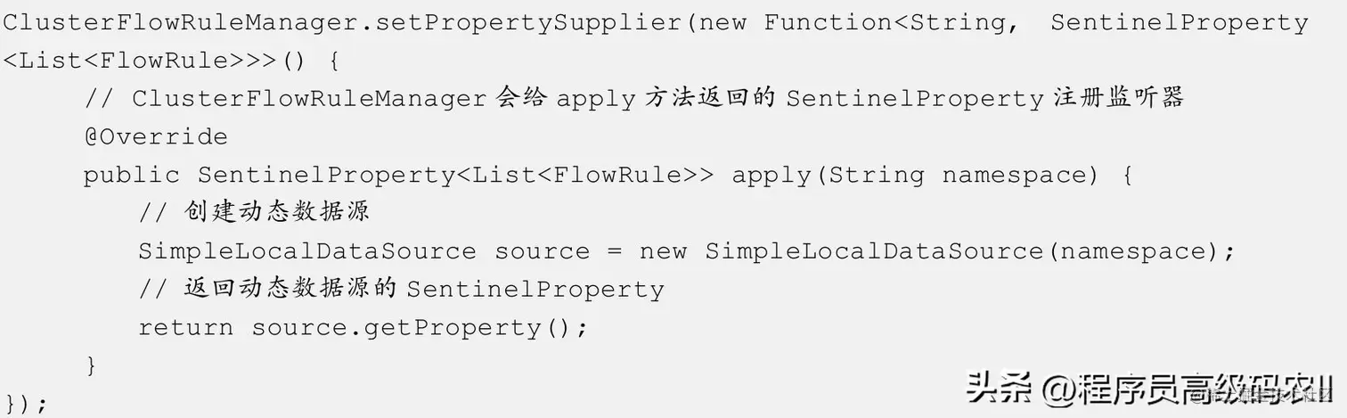 接下来需要为集群限流服务端创建用于加载集群限流规则的动态数据源,在创建动态数据源时,需要指定数据源只加载哪个名称空间下的限流规则配置,代码如下。