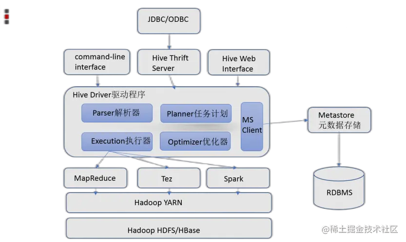 - 执行引擎:Hive本身并不直接处理数据文件。而是通过执行引擎处理。当下Hive支持MapReduce、Tez、Spark3种执行引擎