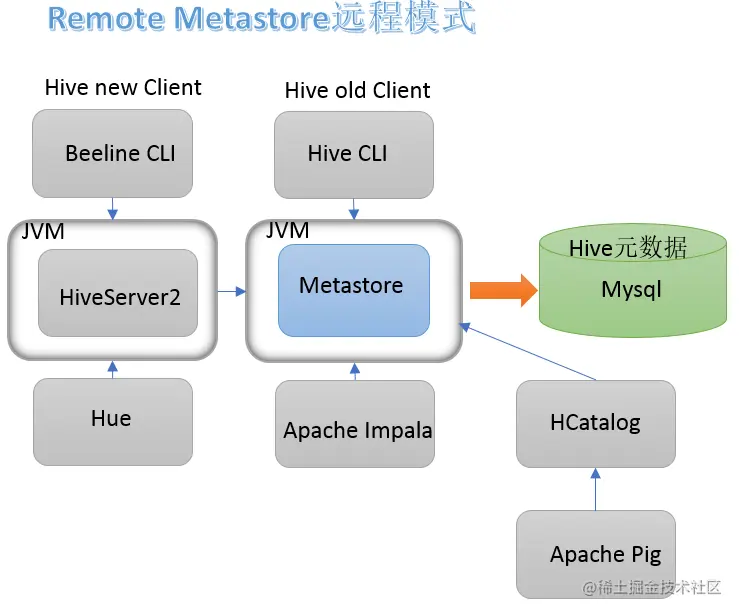 在远程模式下,其他依赖hive的软件都可以通过Metastore访问hive。由于还可以完全屏蔽数据库层,因此这也带来了更好的可管理性/安全性