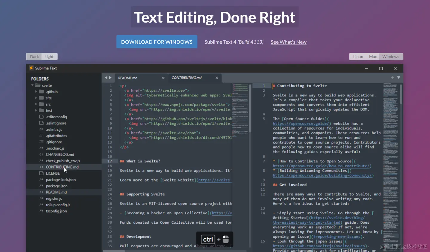 Sublime Text是一款优雅和强大的文本编辑器,可以用于编写代码、标记和文本。你可以使用Sublime Text来编辑多种语言的代码,并享受其快速、灵敏和美观的界面。Sublime Text还提供了多重光标、代码折叠、自动完成、插件等高级功能,让你的文本编辑更加高效和舒适。
