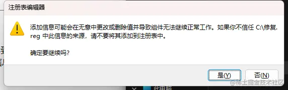 3,双击 "修复.reg" 执行,对于弹窗点击是否继续?选择“是”。然后重启一下电脑就可以正常安装了。