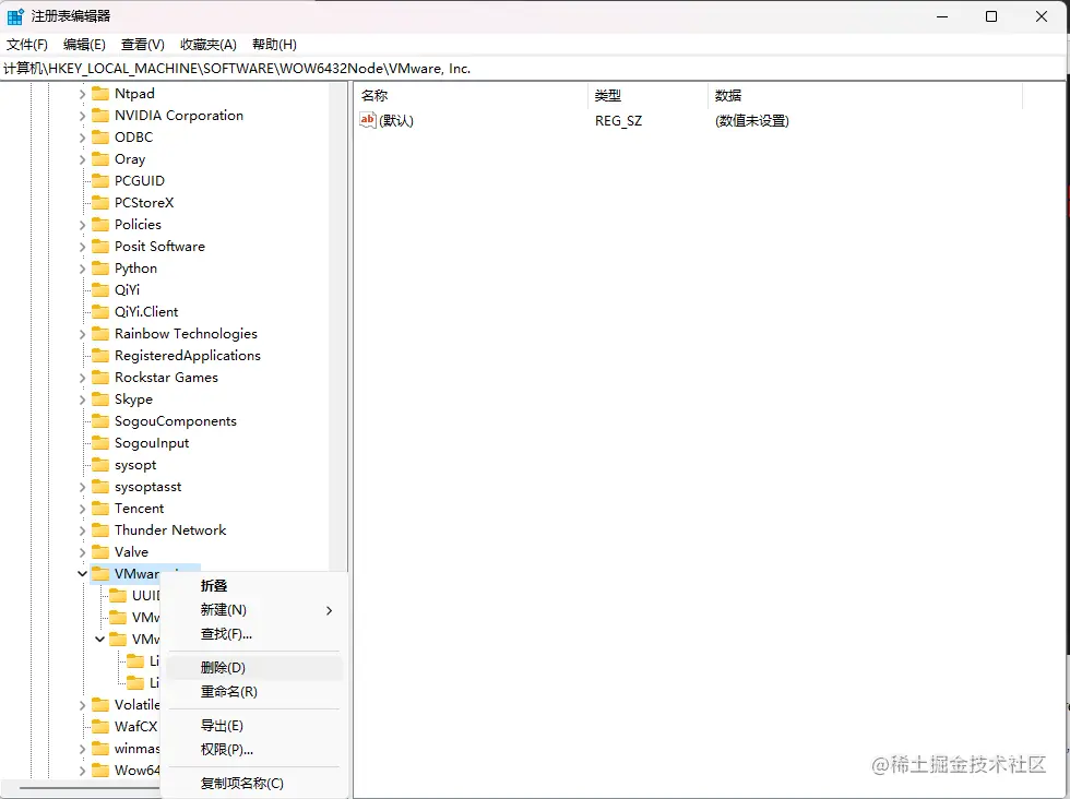计算机\HKEY_LOCAL_MACHINE\SOFTWARE\WOW6432Node\VMware, Inc.