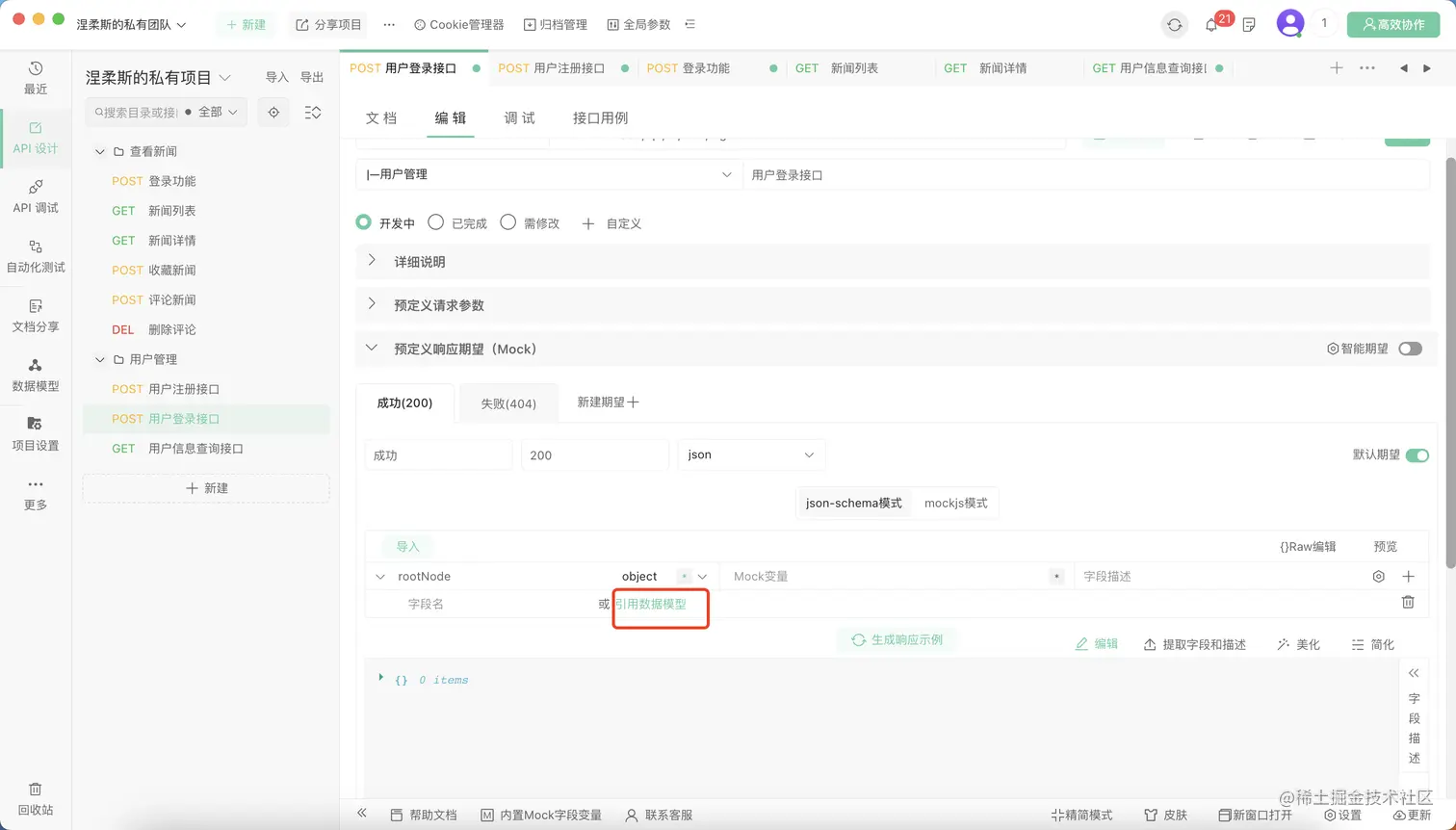 在接口编辑页面(API设计)预定义响应期望下点击引用数据模型,即可将创建好的数据模型引入